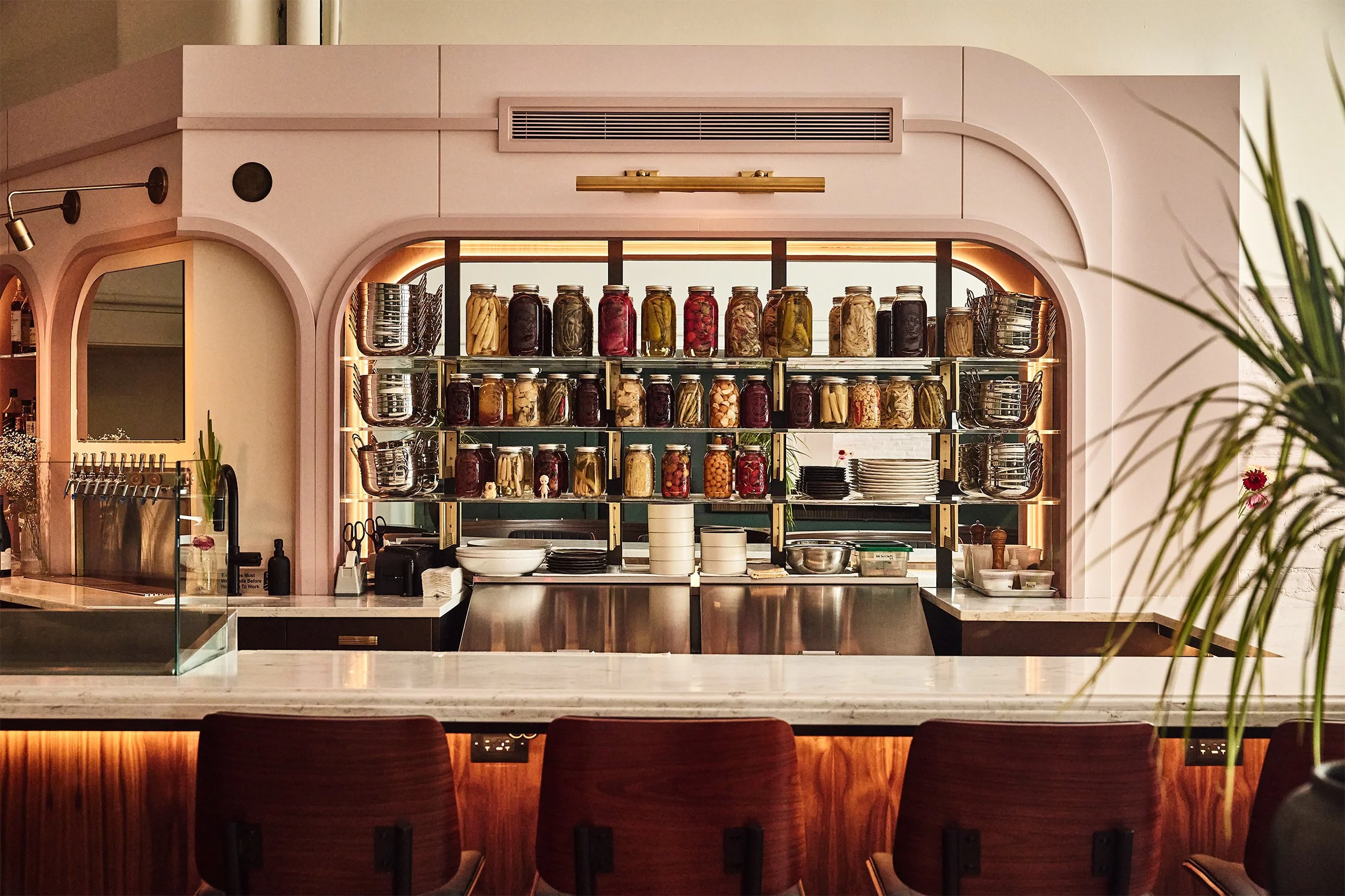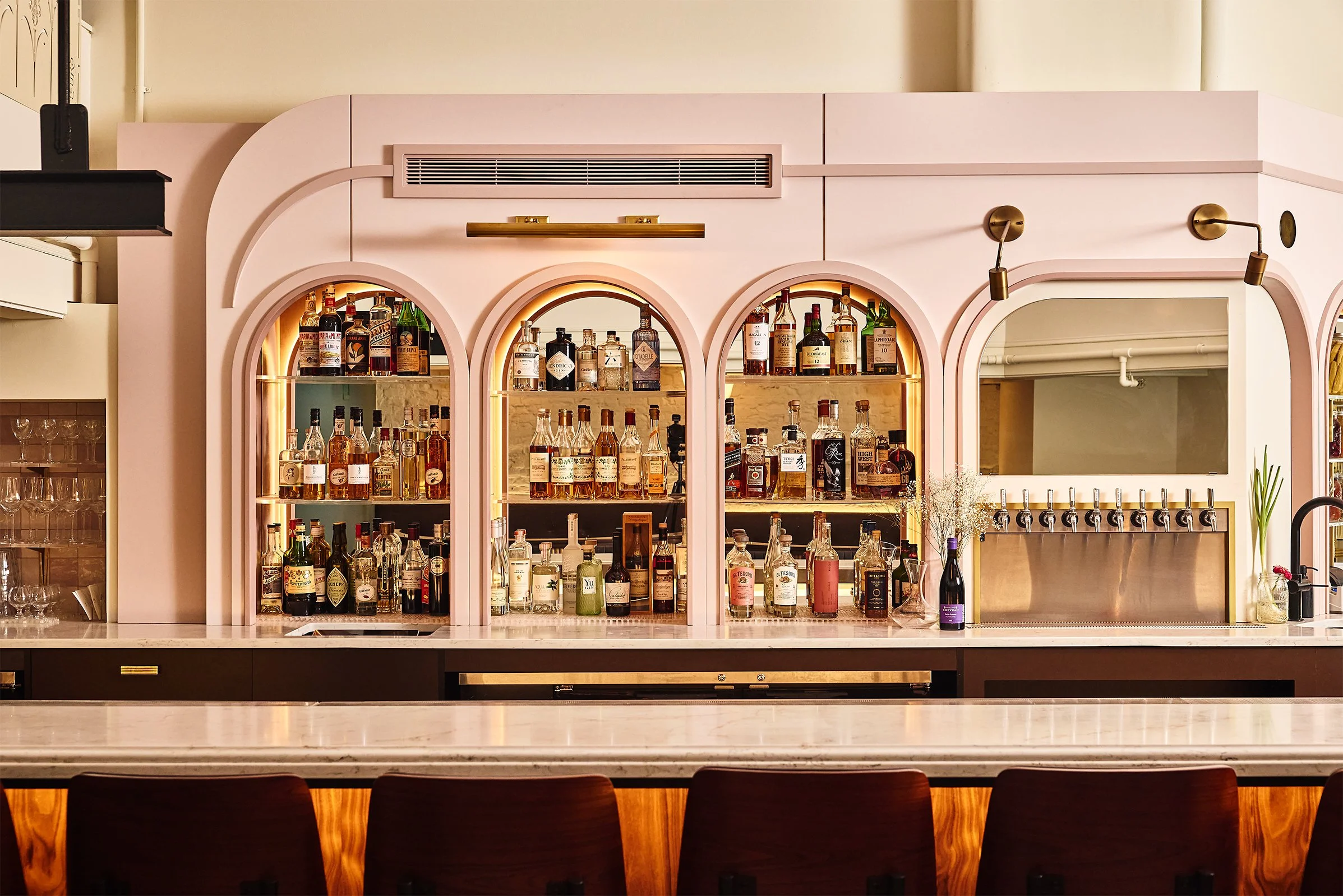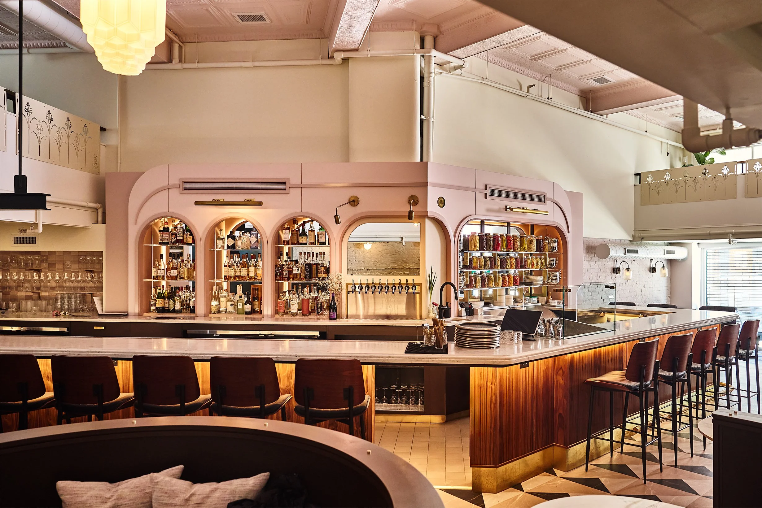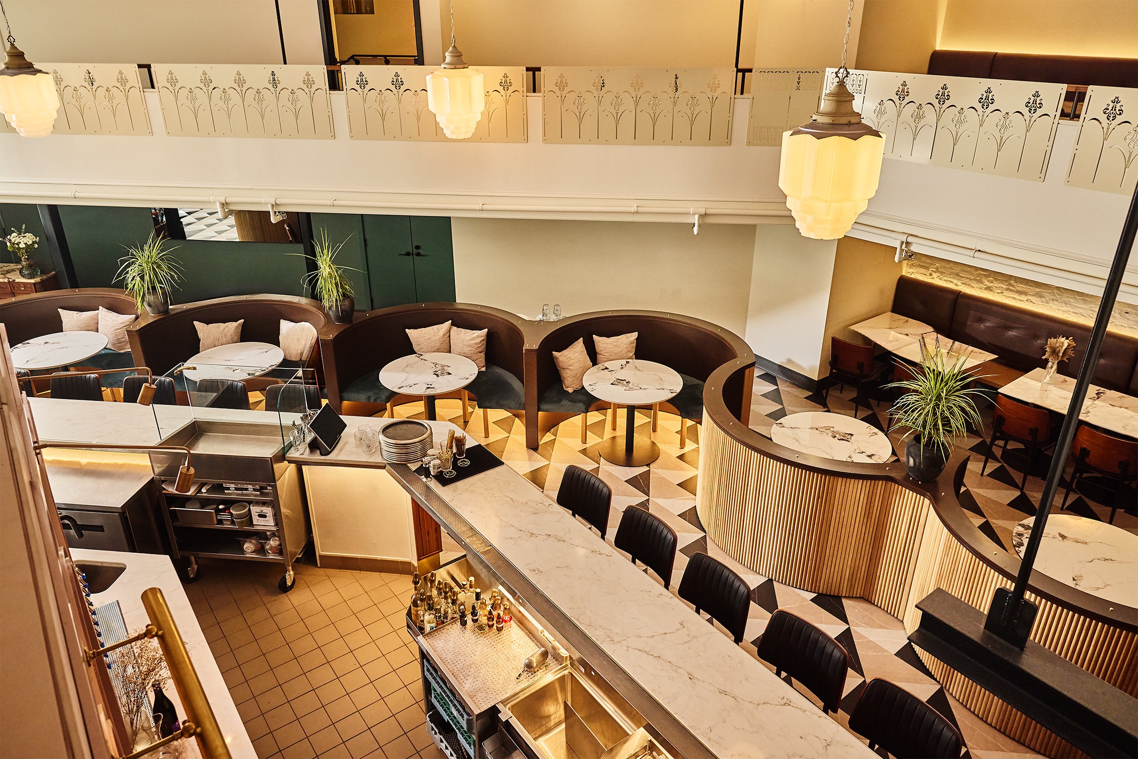The first thing you’ll see as you approach the building is a fully restored storefront and double doors, which we brought back from a time forgotten. You'll enter into a steel and glass vestibule with another door that welcomes you into the space. Weaving its way through the main dining room is an almost serpentine banquette that is wrapped in white oak tambour with velvet upholstery done by Tiberi studios throughout.